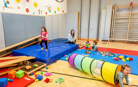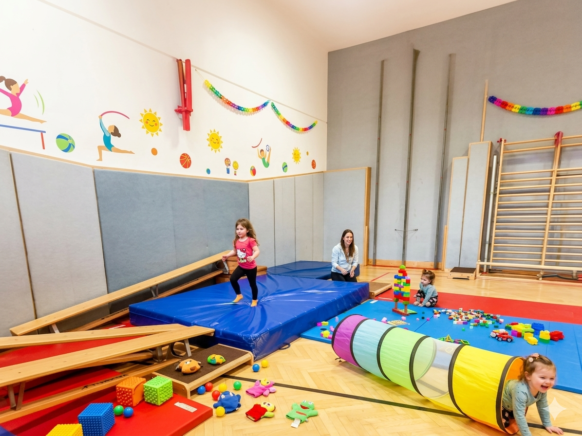 Damit du entspannt trainieren kannst, gibt es direkt in der Turnhalle eine gesicherte Spielecke für Kinder. So bleibt dein Kind in Sichtweite, während du dir bewusst Zeit für deine eigene Bewegung und dein Wohlbefinden nehmen kannst. Das macht es leichter, Training in den Alltag zu integrieren – ohne zusätzlichen Organisationsstress.